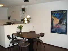 Das Wohnzimmer verfügt über einen Essbereich, ein Sofa mit zwei Stühlen und einem Breitbild-LCD-Fernseher, Stereoanlage und Bücher.
